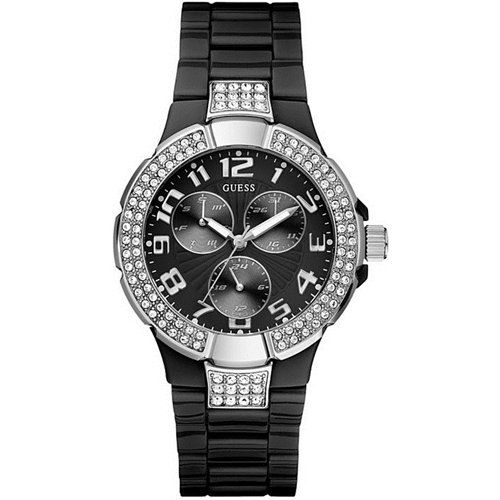 Take status into your own hands with this brilliantly dazzling black and crystal multifunction watch. ? Multifunction: day, date and 24 hour international time ? Watch dimensions in mm: 40.5/40.5/19 ? Polished silver-tone and black case with crystal embellishments ? Black dial ? Black polycarbonate bracelet ? Water resistant up to: 100 m/330 ft ? 10 Year Limited Warranty Women's Accessories > Watches > Guess Watches RelateItems- GUESS Stainless Steel Bracelet Watch - Silver